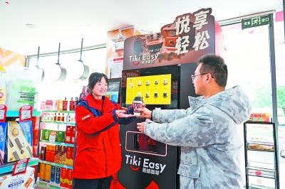 日前,浙江石油32台易捷全自动式咖啡机在嘉兴地区试点投用,进一步强化加能站差异化竞争优势,加快打造“车生态+家生活”服务场景。图为顾客在嘉兴石油东升路加能站购买易捷咖啡。乔婷婷 摄