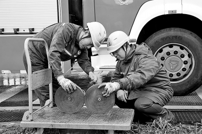 浙江石油绍兴油库员工利用消防车气刹系统的气压释放功能,代替空压机对阻火器的波纹板进行吹扫。李嘉雯 摄