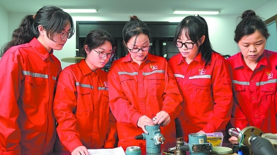 杨莲(左三)与工作室员工维修油井压力变送器。裘国岚 摄