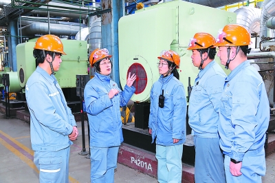 王卿(左二)带领创新工作室团队成员现场讨论优化装置运行的措施。张元旺 摄