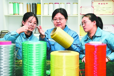 王芳(中)带领研发推广创新团队成员查看产品外观情况。 刘玉福 摄