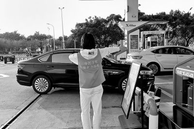 4月28日至5月4日,第八届数字中国建设峰会在福建省福州市海峡国际会展中心举办。福建石油在福州全市100余座加能站设立加油、充电绿色通道,组织党团员志愿者提供道路指引、咨询解答等服务,助力峰会顺利举办。图为福州石油黄山加能站员工提供引车服务。肖 京 摄