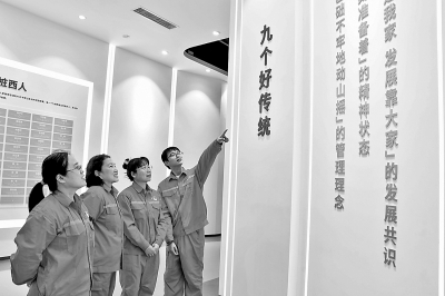 5月11日,胜利油田油藏动态监测中心工程项目部党支部与孤东项目部党支部联合开展优良传统教育主题党日。活动当天,60余名干部员工走进桩西文史馆,认真聆听桩西采油厂“迎难而上 知难奋进”“情系滩海 浪里淘金”的艰苦奋斗史、光辉发展史。图为党员在文化墙前重温“九个好传统”。王花枝 摄
