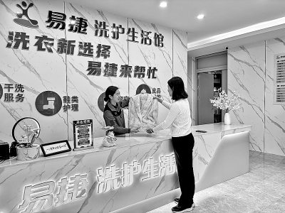 近日,江西抚州石油首座易捷洗护生活馆在临川第一加能站投运,设置高端洗护、家纺洗护、鞋靴洗护、干洗服务四大服务模块,配备专业洗护设备与技术团队,提供衣物鞋包精洗、床品深层护理等全场景服务,一站式解决全家洗护需求。图为员工为客户提供洗衣服务。黄旭敏 摄