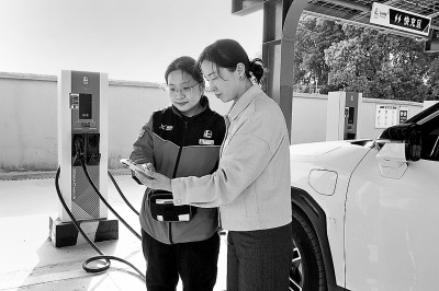 近日,江苏扬州石油首座光储充一体加能站——江都扬帆光加能站正式投运。该站集光伏、储能、充电、洗车、维保于一体,配备14把快充枪、2把超充枪、1把V2G(双向充电技术)充电枪,总功率达967千瓦,为新能源车主提供更加高效舒适的充电体验。图为该站员工服务客户。张 璇 摄