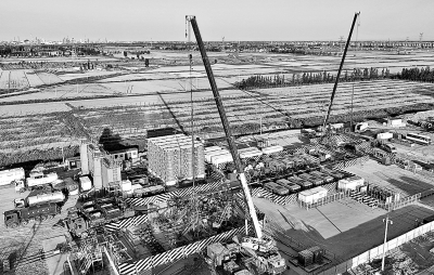 为适应页岩油效益开发新形势,胜利油田在压裂施工中推广柔性罐,实现了安全、高效、经济的现场用水储存。柔性罐相比传统卧式套罐,能够更好地满足大排量压裂施工需求。截至目前,胜利油田在西部工区应用柔性罐55次,在东部工区应用4次。图为6月5日,在胜利油田石油开发中心利页1-3井场,新引进的210立方米柔性罐矗立其中,配合电动混砂装置进行电驱压裂施工。王国章 摄 刘 磊 张远鹏 文