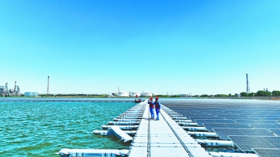日前,青岛炼化首个水上漂浮式光伏发电项目——加氢站西侧水域光伏发电项目高效推进,重要设备光伏箱式变压器顺利安装完成。该项目装机容量7.4兆瓦,建成后年均发电量可达1041万千瓦时,将用于企业生产生活用电,节能降碳效果显著。图为项目现场。本报记者 刘 强 摄