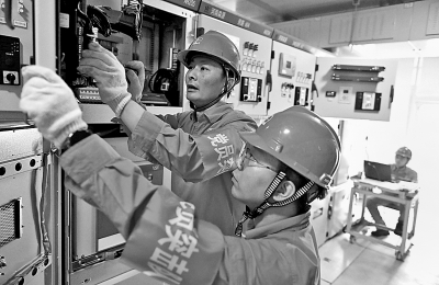 在河南油田魏岗变电站6千伏高压设备隐患改造项目中,电力检修站抽调多名经验丰富、技术过硬的党员,成立党员突击队,加班加点开展高压设备检测与试验工作,确保设备早日投入运行,最大限度减少对原油生产的影响。图为6月16日,党员突击队成员在排查高压电力设备配电线路隐患。戚剑峰 摄 白雪峰 文