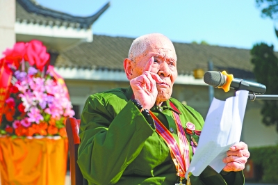 2020年11月,94岁高龄的刘德福为青年干部员工讲述抗美援朝的战斗故事。
