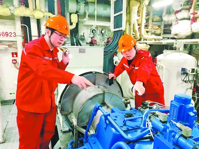 胜利505船作业中心党员、轮机长宗可华(左)带领船员在船舱维护核心设备。