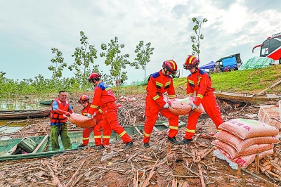 2024年湖南岳阳团洲垸排涝现场,国家危化品应急救援武汉石化队党员突击队员帮助受灾群众转移物资。