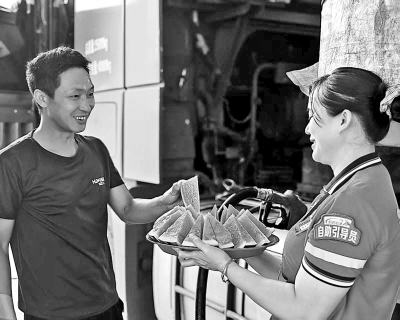 炎炎夏日,广西河池石油推出“夏日送清凉”活动,在加能站设立“清凉驿站”,免费提供绿豆汤、西瓜、矿泉水、防暑药品等,为户外工作者送去关怀。图为6月27日广西河池东南加能站员工为货车司机送上解暑西瓜。 卢啸翔 摄 韦柳双 文