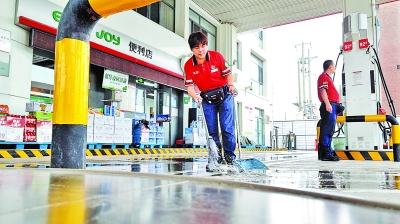 7月10日,北京市气象台发布暴雨蓝色预警,北京石油、燕山石化等企业第一时间行动,迅速启动防汛应急预案,全面部署各项安全环保工作,加强重点设备巡检,为首都能源供应提供坚实保障。图为7月10日北京石油凯旋加能站员工清理站内积水。 房丽丽 摄 支咪咪 李 雪 文