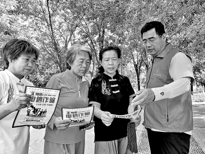 近日,胜利油田老年服务管理中心滨南老年服务部志愿者走进社区,积极开展防诈骗宣传活动。图为7月7日,志愿者发放“预防电信诈骗”宣传页,向居民讲解防范知识,增强防骗意识。肖金禄 摄 路贻霞 文