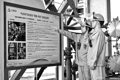 近日,镇海炼化炼油三部开展“操作可视化”专项行动,聚焦关键设备,将复杂的操作票转化为直观的操作示意图,配以设备实物照片、操作要点及潜在风险提示,形成图文并茂的操作说明书,并制作成可视化立牌,确保操作人员在日常生产中做到“操作到位、快速响应”。图为员工在可视化立牌前查看机泵切换操作规范。 张爱超 摄 赵雯钰 文