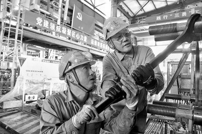 装置检修改造期间,齐鲁石化运维中心党支部党员积极发挥先锋模范作用,在急难险重任务中冲锋在前,推动检修改造顺利进行 。图为7月11日,该公司运维中心烯烃机修车间党员刘壮(右)与技术员合力回装乙烯气压缩机部件。李建强 摄