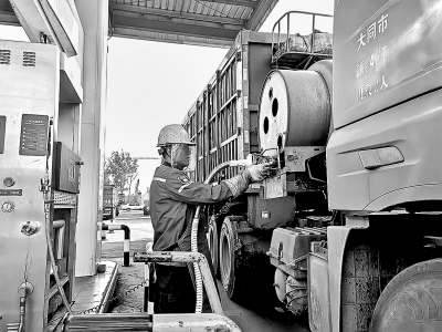 今年以来,山西石油聚焦天然气业务增量创效,通过优化网络布局、强化资源统筹,抢抓市场机遇,开拓销售渠道。上半年,天然气销量同比增长154%。图为朔州石油小峪加能站员工为货车加气。边伟涛 摄 秦晓耕 文