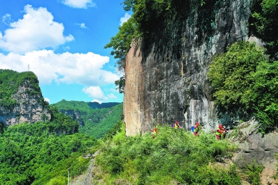 日前,在湖北省利川市百丈沟的峡谷绝壁间,地球物理公司SGC2127队员工开展野外作业。这是江汉油田在南方山地部署的首个二次采集项目——鄂西渝东地区石柱复向斜红星三维地震采集项目的施工区。SGC2127队员工面对森林茂密、深沟纵横的复杂地形,开展地震勘探,努力寻找油气。图为7月26日该队放线班员工穿越悬崖开展作业。 张广虎 摄 章 汉 文