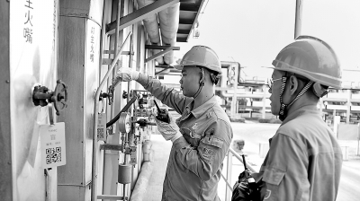 今年以来,海南炼化聚焦装置节能降耗、工艺操作优化及目标产品收率提升等环节精准施策,在解决反应器入口温度波动问题的同时,有效降低加热炉燃料气消耗量,实现降本增效。图为8月5日操作人员调整提升加热炉燃烧效率。朱仁俊 摄 邱元广 文