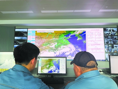 上海石化员工利用水文气象监测系统观察台风“韦帕”的卫星云图。
