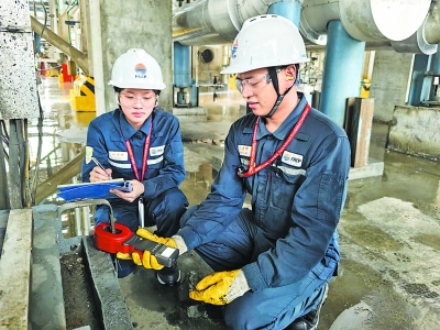 福建联合石化员工根据雷电预警系统信息提示,对关键设备进行防雷接地检查。