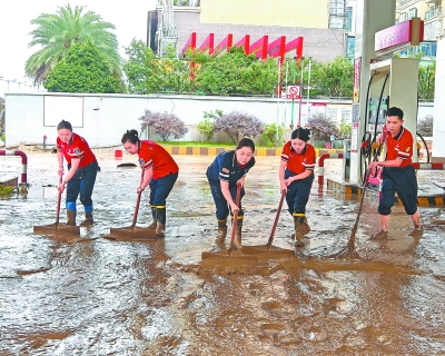 贵州黔东南榕江县遭受洪灾,榕江桥头加能站员工在洪水退后清理淤泥。魏 伟 摄