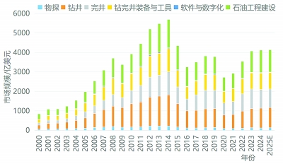 阅读提示 油气工程作为油气勘探开发产业链的重要环节,其技术进步为油气勘探开发高质量发展提供可靠保障。随着油气勘探开发进入“深水深层”阶段,对油气工程技术创新提出了更高要求。本版根据中国石化石油工程技术研究院发布的《全球油气工程行业发展报告(2025)》,分析产业和市场形势、公司动向、科技创新方向,为油气工程高质量发展提供决策参考。 本版文字除署名外由 光新军 张进双 闫 娜 姚云飞 提供 市场动向——全球油气工程市场将持续稳定 作为油气勘探开发产业链的重要环节,油气工程承担着助力油气勘探开发高质量发展和保障油气供应安全的重要责任。特别是油气工程技术创新对提高油气勘探成功率、提高产量和采收率具有决定性作用,是促进油气增储上产、降本增效的重要途径。围绕保障油气增储上产,我国油气工程产业规模逐渐扩大,随着“大力提升油气勘探开发力度七年行动计划”推进实施,油气上游投入力度持续加大,勘探开发年平均投资超过3500亿元,油气工程市场规模由2018年的1581亿元增长为2024年的2000多亿元。 2024年,全球能源转型持续推进,能源结构深刻调整,全球油气供应充裕,需求保持增长,国际油气价格持续回落,振幅收窄。全球油气勘探开发投资小幅增长,低碳领域投资已超越油气。2024年,全球油气工程市场保持稳定,比上年增加1.4%,至4127亿美元,其中石油工程建设、钻井、钻完井装备与工具市场分别增长6.8%、2.2%、2.1%,完井、物探市场分别下降4.7%、4%;陆上市场下降2%,至2758亿美元,海上市场增长9.1%,至1369亿美元。 2025年及“十五五”期间,油气价格下行压力较大,勘探开发投资保持稳定。传统油气工程市场增长空间有限,市场结构发生重要变化,受气候变化和能源转型影响,油气产量在中长期内相继达峰,传统油气工程市场也将在2030年左右出现峰值(4300亿美元左右);非常规、海上油气工程市场持续扩张。短期和长期区域市场发展态势分化,中东和非洲油气工程市场预计2025年增长3%~5%,增长趋势将延续较长一段时间;南美和俄罗斯油气工程市场预计2025年分别增长4%和17%,至2030年年均增长3%~4%;北美、亚太市场短期下降,中长期有望保持增长态势,预计至2030年年均增长1%~2%。快速发展的低碳能源工程市场将成为关注焦点,油公司拓展新能源和低碳业务,油服公司利用传统油气工程技术提升新能源和低碳服务能力,地热、储能、CCUS等工程市场潜力较大。市场竞争加剧,综合油田服务公司持续推进全面转型,承包商聚焦提升专业竞争力,积极谋划“第二增长曲线”。 公司动向——国内外油田服务公司发展趋势 1.三大国有油服公司(中油技服、石化油服、中海油服)聚焦主责主业,增强核心功能,持续提升战略支持能力。 一是不断优化经营模式,加快建立适应新质生产力发展要求的管理模式和组织架构,推动石油工程“四提一降”,打造一批标志性工程。中油技服试点阿米巴经营模式,将钻井提速、控降成本融入考核,通过放权赋能、严格考核兑现等措施,提升基层单元创效能力。 二是创新服务模式,提升一体化支撑能力,全产业链支撑提效。中油技服探索边缘探井、风险探井日费制等管理机制,由以年计到以日计,推动甲乙双方风险共担、效益共享。石化油服以业主需求为主导,提供不同形式的大包、总包服务,带动高附加值业务发展。中海油服进一步巩固国内一体化多元模式,勘探开发一体化助力油田开发稳产超产。 三是瞄准国家重大需求,强化科技规划,优化科研体制机制,推进关键核心技术突破。三大国有油服公司注重技术发展的顶层设计和基层基础双促进,不断提升专业和产业链完整性,推动产业全面升级和生产力整体跃升。中油技服打造“研发组织、条件平台、科技攻关、科技保障”四大体系,实施分级授权,形成研发线、产品线、服务线“三线合一”的科研攻关体系,推进“平台+项目”管理,建立对产品负责的科研管理机制,加快成果转化。中海油服构建并推行“I4R(Integration、Iteration、Investment、Industrialization Research)”,即一体化、持续迭代升级、投资决策导向型、工程化的科技创新体系。 四是系统推进数智融合赋能,推动全产业链数字化升级。中油技服强化数字化发展谋划,建立标准规范,促进装备技术、队伍操作和生产组织方式转型。中海油服谋划“1+1+6+N”软件规划蓝图,推动公司服务从有形产品到生态式无形产品的转变。石化油服聚焦石油工程技术、装备、安全等核心业务开展人工智能大模型探索攻关,加快智能钻完井、智能压裂、井场智慧管控等领域的技术创新。 2.国内民营油服公司不断拓展全球业务布局,持续提升市场运营能力。 杰瑞在北美设立研发中心,中标美国页岩气项目,2024年在北美市场收入占比超15%。安东与伊拉克国家石油公司成立合资公司,总部设在中东,2024年在中东市场营收突破20亿元。惠博普依托“一带一路”拓展哈萨克斯坦、阿尔及利亚市场,海外订单占比达60%。通源石油在北美推广射孔新技术获得客户认可。新锦动力集团通过了阿布扎比国家石油公司供应商准入审核。 3.全球一流综合性油服公司引领数字化绿色化发展。 全球一流综合性油服公司持续推进“开放地下数据空间”(OSDU)建设,强化软件、系统的兼容,推动智能化、自动化装备的应用。形成“平台+AI+软件+工具装备”一体化