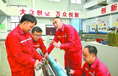 10月5日,在中原油田采油气工程服务中心创新工作室,集团公司技能大师、感动石化人物杨相杰(右二)带领三位徒弟开展技术创新。从图纸到计算,再到反复调试,杨相杰耐心指导徒弟们稳步操作。双节假期,他们将对祖国的祝福、岗位的热爱,凝聚在持续攻关创新中。 胡庆明 摄 孙 博 文