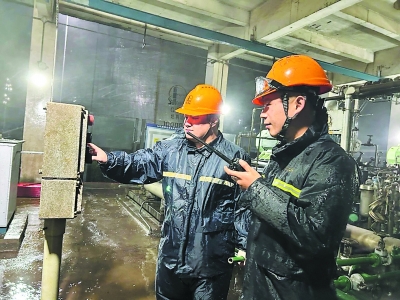10月5日,强台风“麦德姆”登陆广东湛江。中科炼化的干部员工逆风而行,全力守护装置平稳生产。图为10月5日晚,炼油四部员工在加氢区域维护设备运行。黄 梅 摄 吴金梅 文