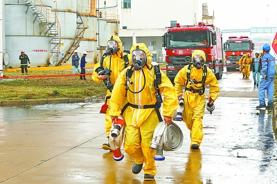 “雷霆行动”开展以来,中安联合积极开展重点区域和关键部位隐患排查整治工作。同时,狠抓日常应急预案演练,促进员工应急处置能力和各部门协同配合能力不断提升。图为10月15日,热电装置开展液氨储罐模拟泄漏事故应急演练,消气防联动冒雨快速进行应急处置。赵天奇 摄