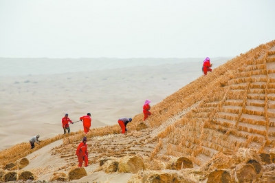 顺北油气田位于“死亡之海”塔克拉玛干沙漠腹地。这里绿化成本高、难度大,西北油田优选编扎草格的方式进行防风固沙,成效显著。李学仁 摄