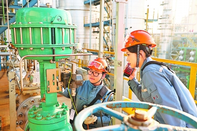 镇海炼化炼油七部催化装置外操员工在核对阀门开度。