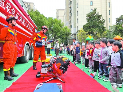 11月6日,上海石化消防中心走进上海市金山区海丰幼儿园,为210名师生带来了一场以“走进校园,安全‘童’行”为主题的沉浸式安全知识体验活动。 消防队员通过18米举高喷射消防车出水演示、实用的灭火器使用讲解、高科技的消防智能四足机器人展示,以及高精尖的器材装备展示等一系列举措,让萌娃们在欢声笑语中零距离学习消防知识,筑牢安全防线。 图为消防队员展示各类消防器材装备。 邢秀涛 摄