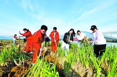 11月22日,中原油田文留采油厂工艺研究所与油田勘探开发研究院内蒙开发研究所联合开展助农活动,党员及技术骨干走进田间协作采收大葱。 丰建法 摄