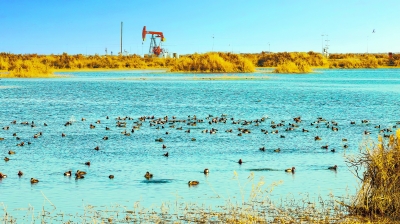11月19日,成百上千只野鸭、红嘴鸥、白鹭等候鸟在西北油田TH10361油井周边水域游弋觅食,绘就一幅美丽生态图。 石立斌 摄