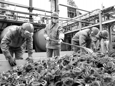 近日,南化公司苯化工部党委组织专业室党支部与氯碱作业区党支部党员集中清理硝基氯苯废水塔填料,3天共回收金属填料6立方米,节约外委费用近6万元。图为12月9日,党员带头在现场清理填料。裴 昱 摄