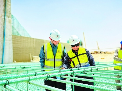 图为朱尼尔(右)对现场钢筋绑扎工作开展安全检查 。郑思远 摄
