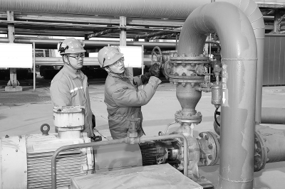 今年以来,沧州炼化加大节水减排力度,通过回收雨水并入污水系统、强化污水处理装置运行管理、开展技术攻关及小指标竞赛等多种措施,提升污水回用率。截至11月底,污水回用率创历史新高。图为12月18日员工巡检污水处理装置。张元旺 摄