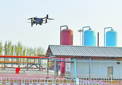 中原油田卫11注采站实现无人机定时高空智能安全巡检。仝 江 摄