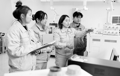 近日,2025年湖南省总工会重点支持的劳模和工匠人才创新工作室名单揭晓,湖南石化赵辉创新工作室入选。该创新工作室成立于2022年,重点围绕耗时长、工作量大、自动化水平低的分析方法进行攻关,为生产运行和项目建设提供了精准分析检验数据。图为1月4日赵辉向工作室成员讲解分析检验要点。 本报记者 彭 展 摄