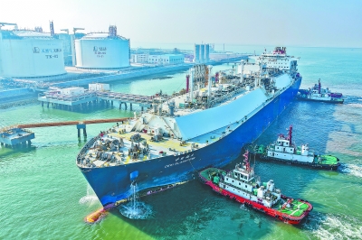 1月5日,满载约7万吨LNG的“中能福石”号LNG运输船靠泊天然气分公司天津LNG接收站,这是天津LNG接收站今年接卸的首船LNG。截至目前,该站累计接卸LNG超4200万吨,向京津冀地区供气超500亿立方米,持续保障华北地区民生用气。图为接卸现场。 王 军 摄
