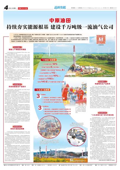 “十四五”成绩单 •矿权面积增长30% •原油产量连续6年保持增长 •海相酸性气田主阵地稳产期再延长8年 •在站及留用博士后112人 •研发投入连续5年保持10%以上 •申请国家专利1193件 •建成145亿立方米国内最大的储气库群 “十五五”启新程 3个新格局 •“常规油气+非常规油气”资源并重 •“化石能源+绿色能源”双轮驱动 •“多专业协同+全产业链创效”多元并行 3个发展目标 •建设具有一流能源保供力的现代化能源公司 •建设具有强劲价值创造力的现代化能源公司 •建设具有广泛社会影响力的现代化能源公司 1月5日,中原油田党委召开会议,确立“加快打造千万吨级一流油气公司,奋力开创‘十五五’高质量发展崭新局面”的战略目标。 新征途的航标,由历史的火炬照亮。 “十四五”以来,中原油田坚持以习近平新时代中国特色社会主义思想为指导,全面贯彻党的二十大和二十届历次全会精神,认真落实集团公司党组部署要求,扎实开展“牢记嘱托、感恩奋进,创新发展、打造一流”主题行动,深入实施油气增储上产“七年行动计划”,勇担上游创效主力军使命,全力保拓矿权、增储上产、提质增效,原油产量稳步提升,天然气保持稳产高产,高质量发展指标显著提升。 夯实压舱石 增储上产铸就坚实根基 中原油田始终牢记为国找油找气的初心使命,坚定不移加大油气勘探开发力度。 资源根基更加厚实。成功竞获南华北、内蒙古、濮阳煤层气12个区块,矿权面积增长30%。强化新领域、新层系油气勘探,取得11项勘探突破和4项商业发现,成功落实5个千万吨、3个千亿立方米规模增储阵地,探明储量规模实现翻倍跃升。2025年东濮凹陷新增第20个油田,资源家底更厚,发展后劲更足。 原油产量连年攀升。积极应对国际油价下行,坚持新区效益建产与老区精准补能同向发力;构建快速滚动增储、高效建产和油藏分级治理运行体系,原油增量规模持续做大;自然递减稳居上游领先水平,全口径单位完全成本下降23%,产量由125万吨上升至137.2万吨,老区上产焕发出新活力。 天然气安全高效稳产。坚持“稳老区、扩新区、拓资源”,深挖海相酸性气田主阵地,主体稳产期再延长8年,成功打造全球酸性气田高效开发的“中国样本”。积极探索致密气、页岩气等新领域开发技术对策,全力攻坚川东北致密气规模建产、页岩气评价建产,产量跃升至3.1亿立方米。到2025年,中原油田累计产气量达1392亿立方米,为保障国家能源供应注入强劲动能。 “十四五”期间,中原油田累计生产原油652万吨、天然气345亿立方米、硫黄906万吨。 点燃强引擎 科技创新驱动产业跃升 中原油田围绕卡点难点奋勇攻坚、聚力突破,科技创新对产业发展的贡献率显著提高。 科技创新实现量质跃升。深度融入国家和集团公司创新体系建设,扎实开展“十四五”后三年科技攻关,首创矩阵式攻关、大兵团作战模式,构建跨领域、全链条协同攻坚新格局。攻克超深层页岩气立体压裂、湿气增压开采等43项卡点技术,形成26项标志性成果。普光气田长期稳产技术等一批重大成果引领行业发展,中原油田荣获省部级及以上科技进步奖55项,申请国家专利1193件。深化全油气系统理论研究,致密气、页岩气领域技术实现系统集成,页岩油、煤层气、新能源技术版图加速拓展,战略性技术储备不断丰富。 创新平台跨上更高能级。聚焦国家所需、能源所向,研发布局更加优化,建成集团公司酸性气田开发重点实验室,挂牌页岩油气全国重点实验室示范基地,省部级创新平台实现零的突破。圆满完成上游首批国家原创技术策源地建设,勇担多项国家战略科技任务,成为能源领域关键核心技术攻关的中坚力量。 创新生态全面优化升级。高标准建成集研发、中试、孵化于一体的科技园区,营造开放共享、协同高效的创新环境。科技人才集聚效应持续增强,在站及留用博士后112人,形成一支高水平、年轻化的战略科技队伍。研发投入连续5年保持10%以上稳定增长。深入实施科改示范行动,破除创新壁垒,全面推进科技体制机制改革,系统完善38项制度性保障机制,智能注采等技术实现规模化应用,科技成果转化率持续提升,形成符合战略导向、具有行业特色的科技创新体系。 培育新动能 转型升级换道领跑 中原油田锚定“加快建设新型能源体系”目标,坚持先行先试、锐意突破,新兴产业布局不断优化,发展动能持续增强。 新能源实现技术规模双领先。系统布局战略性新兴产业,国内率先掌握应用质子膜电解水制氢技术,迈入高纯氢制取领域先进行列。创新打造多个分布式绿电应用场景,风光电装机规模、总体绿电消纳占比位居上游前列,树立了行业绿色转型新标杆。建成集团公司首套磷酸铁锂储能系统,落地首个智能微电网示范项目,打造电力调度智能管控平台,构建形成“源网荷储”高效转换的新型能源体系。 高质量建成全国最大储气库群。充分发挥技术领先优势,高标准建成投运8座储气库,创国内储气库建设多个“第一”纪录,形成库容规模达145亿立方米的中原储气库群,成为华北地区天然气季节调峰、应急调度的核心支点。2025年,顺利投产白庙浅层、卫11等3座储气库,达容速度再创新高,天然气战略储备和能源保供迈上新台阶。 数智赋能作用日益凸显。将数智化建设提升到战略高度,持续加强数据治理,大力推进油气生产、科