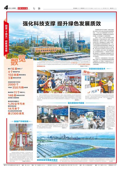 在能源转型的时代浪潮中,创新是破浪前行的核心引擎,绿色是高质量发展的鲜明底色。中国石化以前瞻视野与坚实步伐,实施创新驱动战略,不断激发绿色发展的内在动能,力争再创振兴石化新的辉煌。 回望“十四五”,中国石化加快绿色低碳领域原创性、引领性科技攻关,取得一批重要创新成果。聚焦全产业链,中国石化在油品质量升级、节能减排技术、高端化工材料、综合能源服务等关键领域持续攻坚。从自主研发高端装备降低能耗物耗,到构筑“油气氢电服”综合加能站服务网络;从生物航煤、绿氢制备等前瞻技术取得突破,到CCUS(碳捕集、利用与封存)项目规模化推进;从积极推进智能工厂、智慧油气田建设到不断探索人工智能领域,科技创新的力量不断驱动着传统能源清洁化利用与新能源多元化拓展。 全面开启二次创业新征程,中国石化将锚定“双碳”目标,持续推进科技创新深度融入能源供应、生产制造、产品服务各环节,为推进能源绿色低碳转型和美丽中国建设注入强劲动能。 数览 建设16家智能工厂4个智能油气田 150余座智能加能站 3家智能化研究院 实施能效提升项目近 2000个 节能约350万吨标准煤 建成包括11个供氢中心 146座加氢站在内的 全球最大加氢网络 建成地热供暖能力 1.26亿平方米 拥有充电终端 14万余个 风光发电项目装机规模 超2300兆瓦 攻坚绿色低碳技术 强化数智技术赋能 加强产学研协同 探索低碳发展融合路径