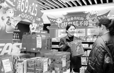 今年以来,福建石油紧抓节日消费机遇,精心装扮便利店,营造节日氛围,优化经营策略和商品陈列,推出多种年货超值礼包,精准满足不同客户的采购需求。1月,该公司易捷服务多项指标实现同比增长。图为近日福建漳州石油朝阳易捷店员工为客户推介年货节活动商品。 王鸿儒 摄