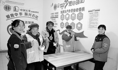 元宵佳节前夕,河南南阳石油在加能站爱心驿站开展暖心送元宵活动,为环卫工人送上温暖,驱散早春寒意。图为2月28日南阳石油宛城溧河站员工为环卫工人端上热元宵。姜明武 摄 赵 畅 文