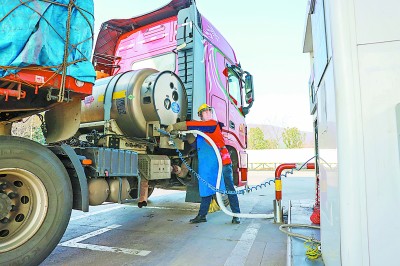 今年以来,安徽石油将LNG经营作为新的效益增长点,通过实施精准营销、优化资源配置、提升服务保障水平等措施,全力拓市攻坚创效,前两个月LNG经营量同比增长44%。图为3月5日合肥石油金山路综合加能站员工为客户加注LNG。本报记者 孙德荣 摄