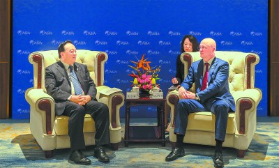 本报讯 3月25日,集团公司董事长侯启军在海南博鳌应约拜会哈萨克斯坦第一副总理斯克利亚尔,双方就持续巩固并深化油气勘探开发、石油化工等领域合作交换意见。集团公司副总经理万涛参加会见。(范立平) 图为3月25日,侯启军在海南博鳌拜会哈萨克斯坦第一副总理斯克利亚尔。张慧慧 摄