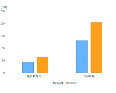 针状焦是生产超高功率石墨电极不可或缺的原材料,而超高功率石墨电极是大型电弧炉炼钢的核心部件。2025年,石墨电极生产对针状焦消费量约44万吨,占针状焦总消费量的25%。我国是全球最大的钢材生产国,但目前仍以高碳排放的长流程炼钢为主,而以废钢为原料的短流程电炉炼钢占比较低,主要受制于废钢资源不足和成本较高,这一现象预计将随着废钢资源量不断增加和碳排放成本约束收紧而得到改善。“十五五”期间电弧炉炼钢将加快发展,从而带动对针状焦的需求增长。预计到2030年,石墨电极用针状焦需求量将增至65万吨,年均复合增长率约8%。