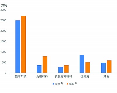 电解铝行业是石油焦最大的下游消费领域。石油焦是生产预焙阳极的核心原料,而预焙阳极则是电解铝生产的关键耗材。2025年,预焙阳极对石油焦的消费量约为2500万吨,占石油焦总消费量的51%。其中,国内自用阳极消费约2250万吨,出口阳极消费约250万吨。“十四五”期间,我国电解铝产量持续增长,2025年产量已达4502万吨,触及4500万吨的政策“天花板”。国家发展改革委等部门已明确电解铝产能上限,并引导行业向再生铝利用、低碳化产能置换转型。预计国内电解铝行业将难以为石油焦需求带来增量,未来需求增长主要依赖出口。预计到2030年,预焙阳极对石油焦的消费量将达2710万吨,年均增长约2%。国内电解铝行业预计将转向结构优化与高质量发展,产品质量、技术优势与节能降碳能力将成为企业核心竞争要素,驱动阳极用石油焦原料低硫、低钒、低排放等高性能指标持续提升。