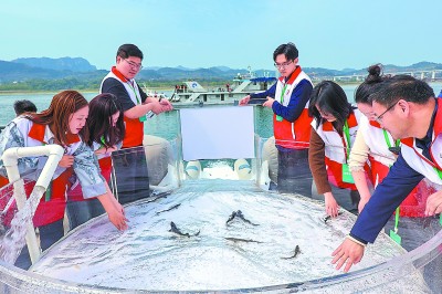 3月28日是“中华鲟保护日”,湖北石油组织志愿者在湖北宜昌放流点参与中华鲟放流活动,以实际行动守护长江生态。此次放流的中华鲟幼苗严格按照有关规定完成种质鉴定和检验检疫,采用多种方式进行标记追踪,用于综合评估和科学研究。图为湖北宜昌石油志愿者将中华鲟幼苗放归长江。 龚华林 摄 侯 悦 文